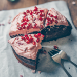 In einer Schüssel die vegane Butter cermig rühren. Den Puderzucker, sowie Mandeldrink und Himbeerpulver hinzugeben. Gut verrühren und auf dem Kuchen verteilen. Mit Granatapfelkernen verzieren.
