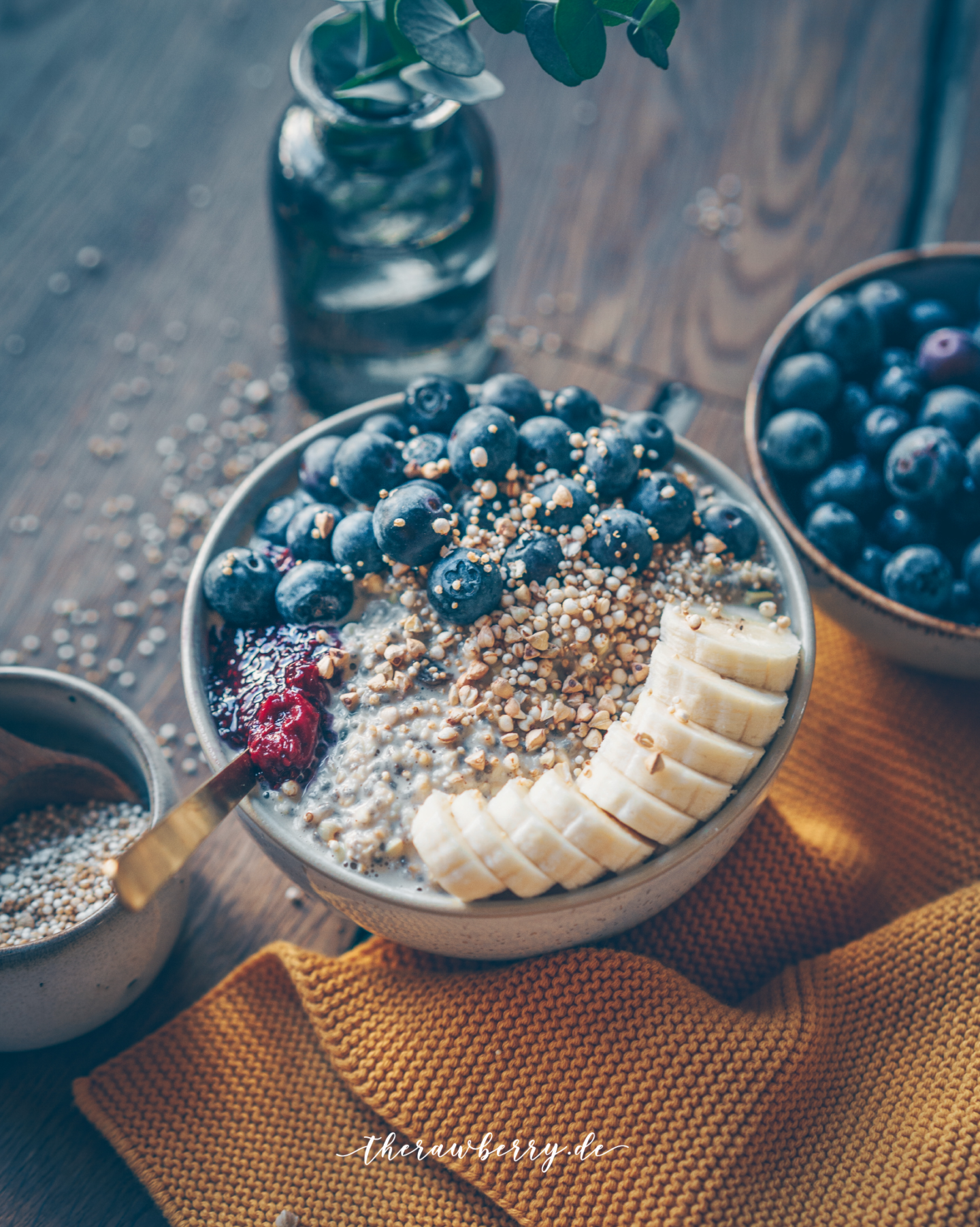 Am nächsten Morgen in eine Schüssel füllen und nach Wahl mit frischen Früchten dekorieren.